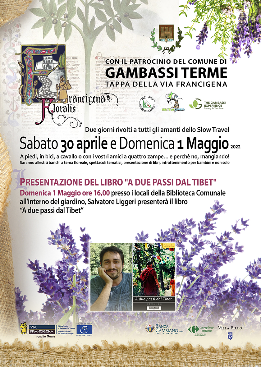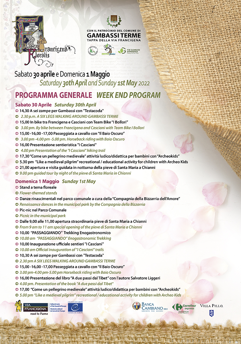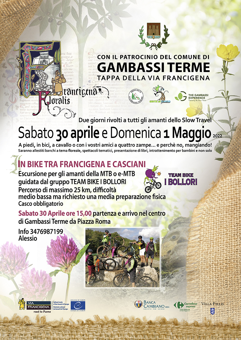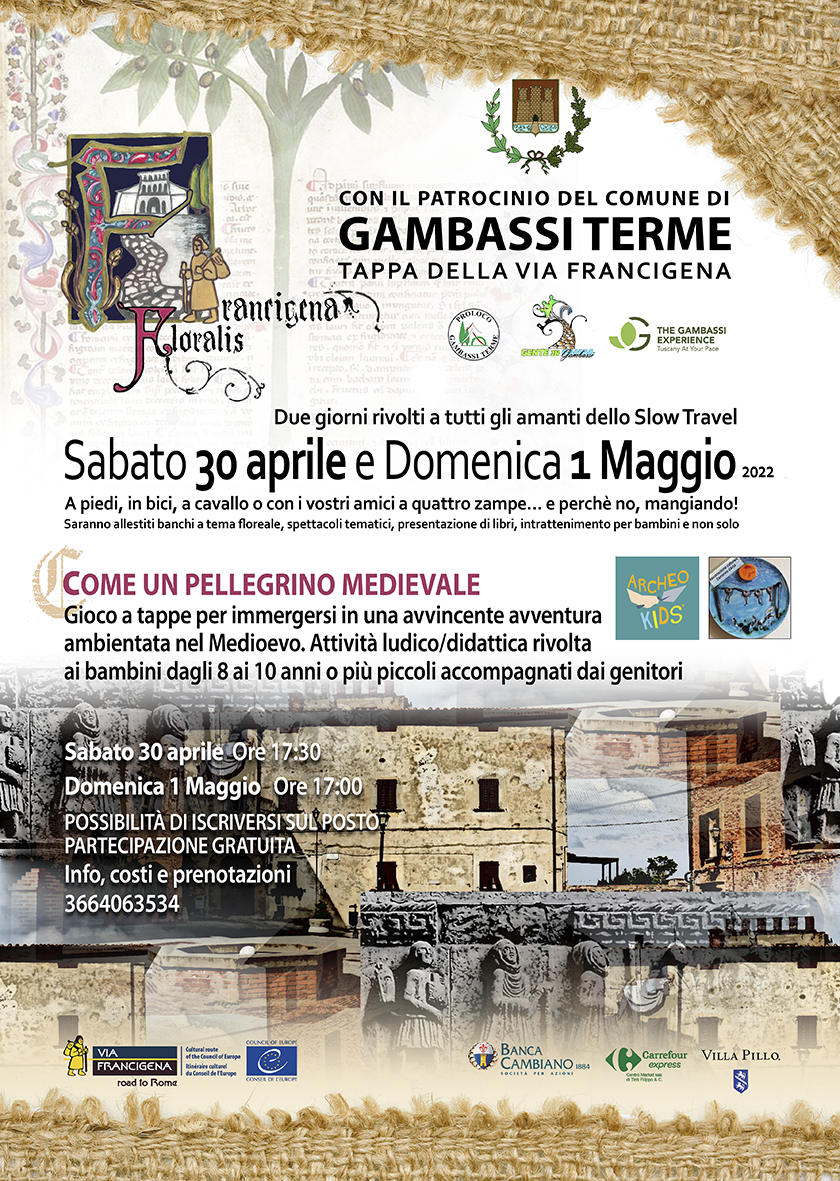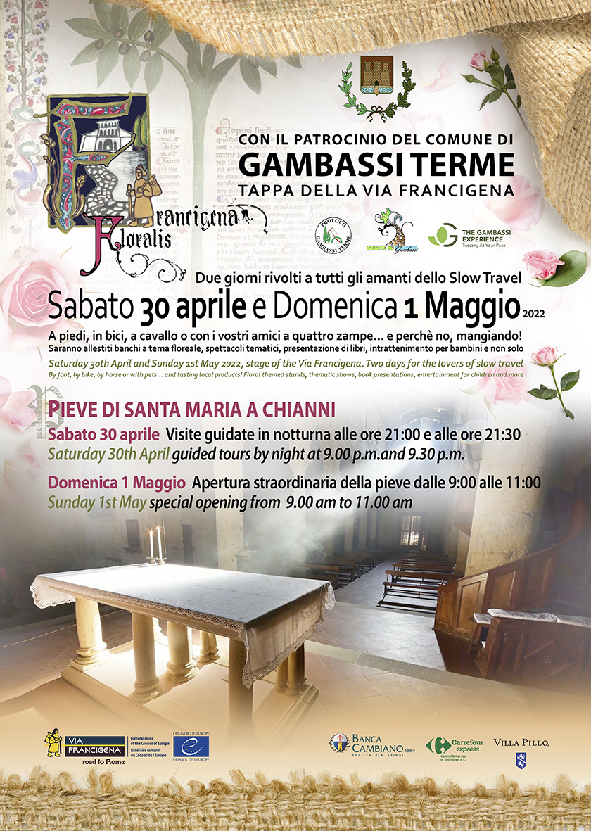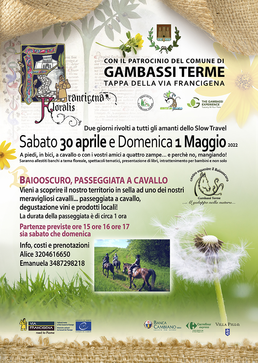 Sabato 30 aprile e domenica 1 maggio Gambassi Terme si animerà con 'Francigena Floralis', la prima edizione della manifestazione dedicata a tutti gli amanti dello slow travel. Tante le iniziative lungo le terre della Valdelsa, nella tappa della Francigena tra natura e storia. Durante gli eventi sarà possibile percorrere i percorsi, in compagnia anche degli amici a quattro zampe, o fermarsi ai banchi allestiti a tema floreale, assistere a spettacoli tematici, presentazioni di libri, intrattenimento per bambini e non solo.