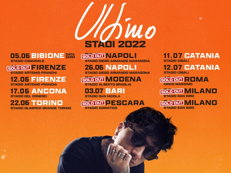 Si aggiungono nuovi sold out al tour negli stadi di Ultimo, prodotto da Vivo Concerti, che riempirà le maggiori città italiane della musica del cantautore nei mesi di giugno e luglio 2022. Raggiungono il tutto esaurito anche gli appuntamenti di Modena e Pescara, dopo i sold out di Roma, la prima data di Firenze e di Napoli e il doppio appuntamento di Milano.
