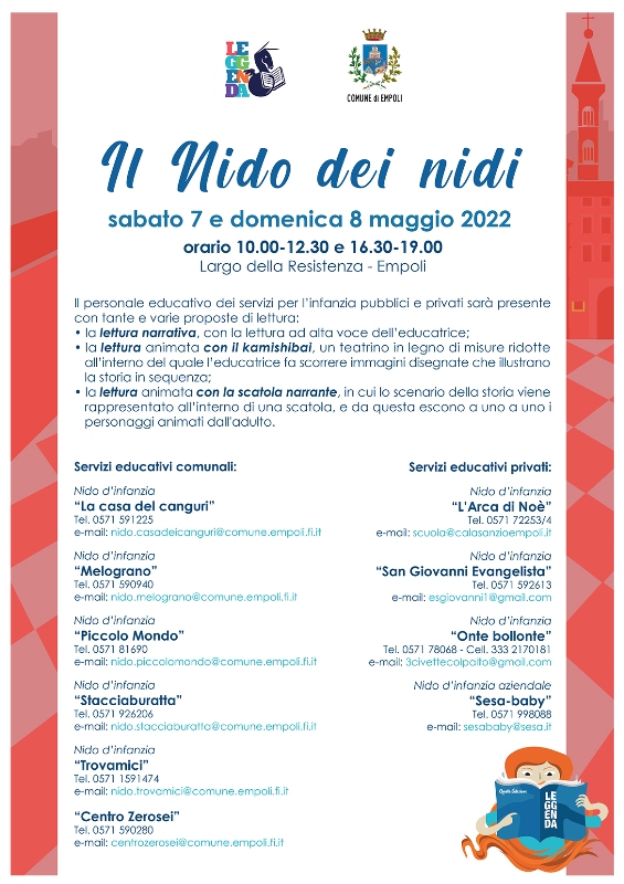 Nelle giornate del Festival sabato 7 e domenica 8 maggio 2022, mattina e pomeriggio, in orario 10-12.30 e 16.30-19, sarà presente lo spazio dedicato al ‘Nido dei nidi’: i servizi educativi per la prima infanzia pubblici e privati presenti sul territorio comunale daranno il loro contributo attraverso un ricco programma dedicato ai piccolissimi, con letture ad alta voce, narrazione e drammatizzazione.