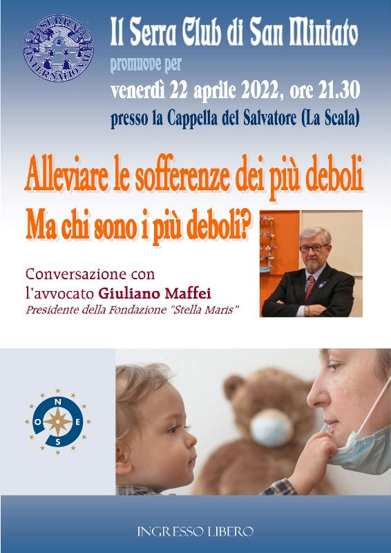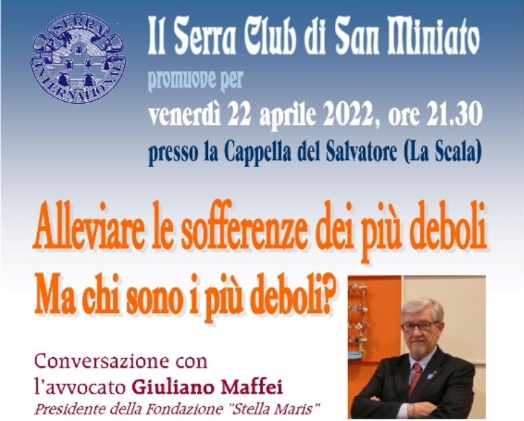 "Alleviare le sofferenze dei più deboli. Ma chi sono i più deboli?" È il titolo della conversazione con il Presidente della Fondazione Stella Maris, avv. Giuliano Maffei che Il Serra Club di San Miniato, presieduto da Maria Grazia Petrucci, promuove per venerdì 22 aprile alle ore 21.30 presso la Cappella del Salvatore (La Scala).
