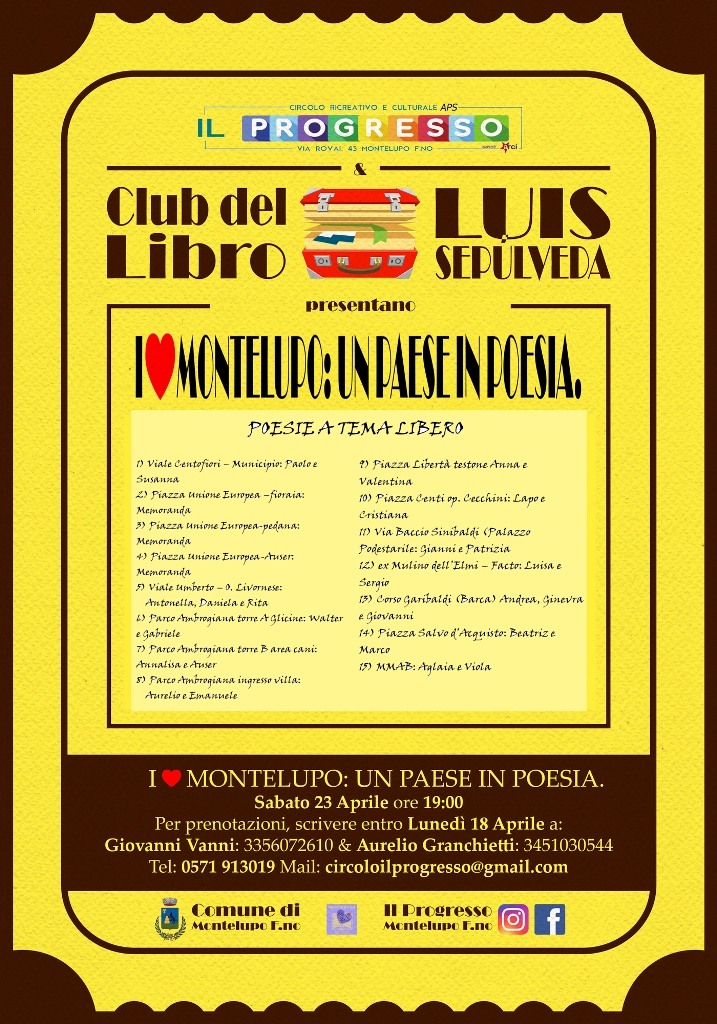 Oggi a Montelupo Fiorentino alle 19 il Club del Libro Luis Sepulveda organizza l'evento Un paese in poesia: in 15 nostri luoghi verranno lette poesie a tema libero. Chi lo desidera può aggiungersi, anche all’ultimo momento, ai volontari che hanno già aderito. Una iniziativa  del Circolo Il Progresso e il club del Libro Luis Sepulveda con  il patrocinio del Comune. La cultura è pace.