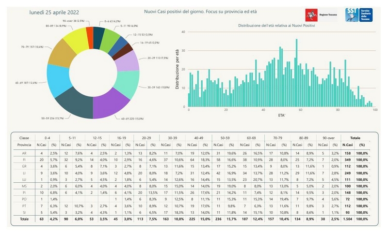 L'età media dei 1.504 nuovi positivi odierni è di 47 anni circa (17% ha meno di 20 anni, 19% tra 20 e 39 anni, 31% tra 40 e 59 anni, 22% tra 60 e 79 anni, 11% ha 80 anni o più).