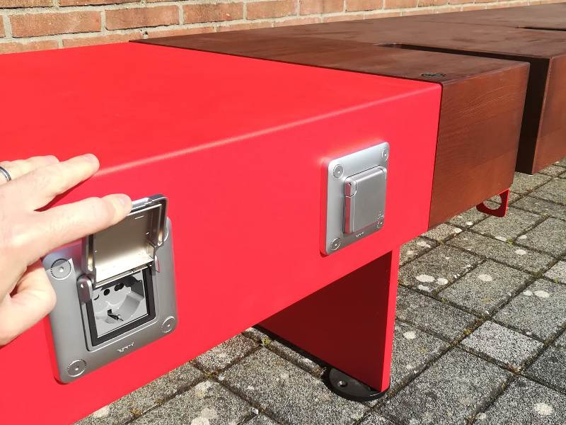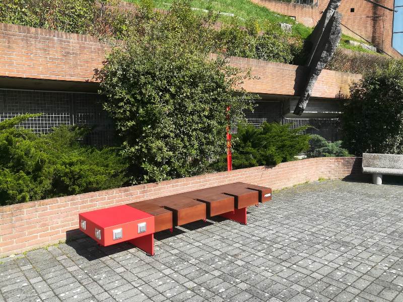 La panchina, in legno, ha 4 posti a sedere e 4 posti bici. A un'estremità, però, ha 6 prese Legrand a 230 V con grado IP 54, perfette per e-bike e dispositivi elettronici. Con massima potenza di uscita di 2,9 kW. L'e-lounge, poi, si presenta come elegante complemento d'arredo nello spazio pubblico, anche grazie all'illuminazione led con sistema di accensione crepuscolare.