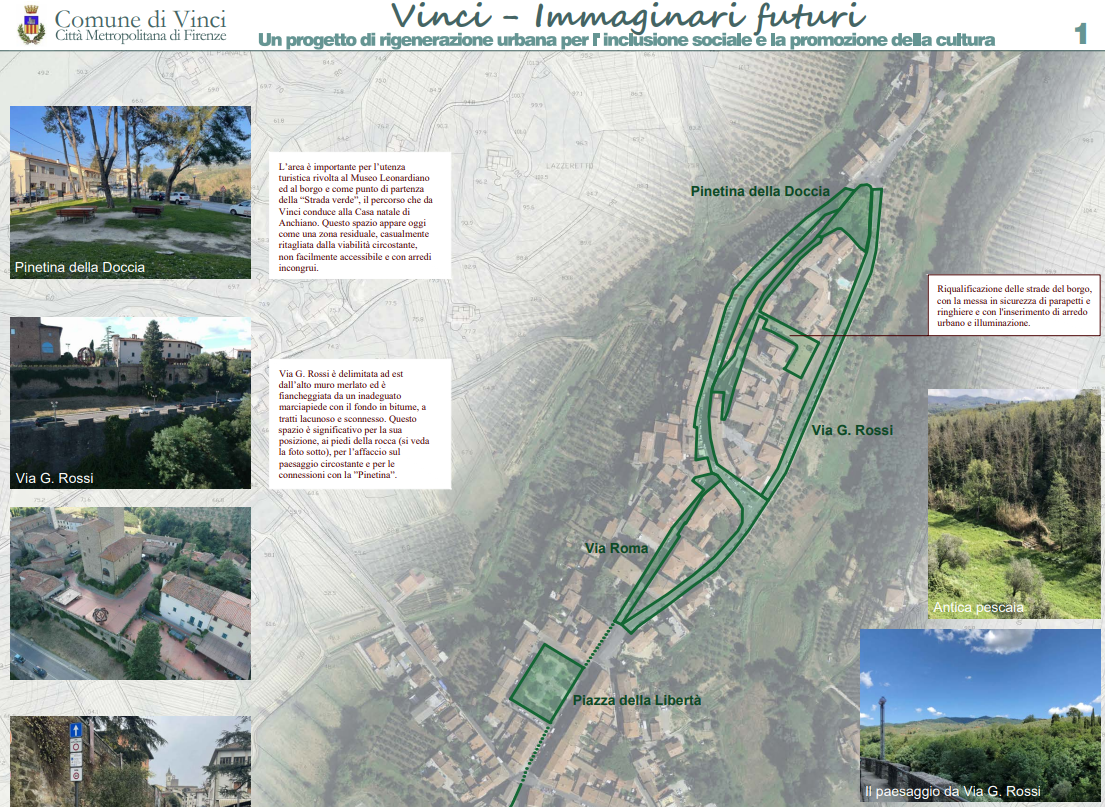 VINCI - Immaginari futuri è il titolo del progetto che prevede il recupero di immobili inutilizzati con il modello dell’albergo diffuso, interessando il borgo di Vinci come centro civico e spazio di aggregazione e mettendo al centro esperienze artistiche legate all’arte contemporanea. Importo: 3.400.000,00 euro. Come ha evidenziato il sindaco Giuseppe Torchia si tratta di una riqualificazione del borgo storico di Vinci, di una riorganizzazione di tutto il centro, con conseguente creazione di nuovi parcheggi, che darà la possibilità di costruire un collegamento tra il Museo leonardiano e la casa natale di Leonardo ad Anchiano.