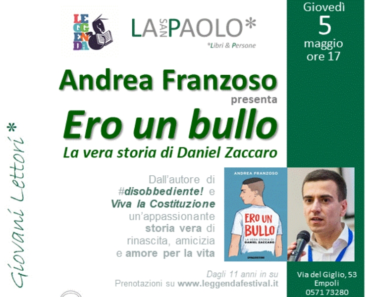 Si presenta giovedì 5 maggio alle 18 'Ero un bullo, la vera storia di Daniel Zaccaro'. Nell'ambito di Leggenda, il Festival della lettura e dell’ascolto organizzato dal Comune di Empoli, La San Paolo libri & persone ospita l'autore Andrea Franzoso per raccontare, una storia di bullismo a lieto fine.