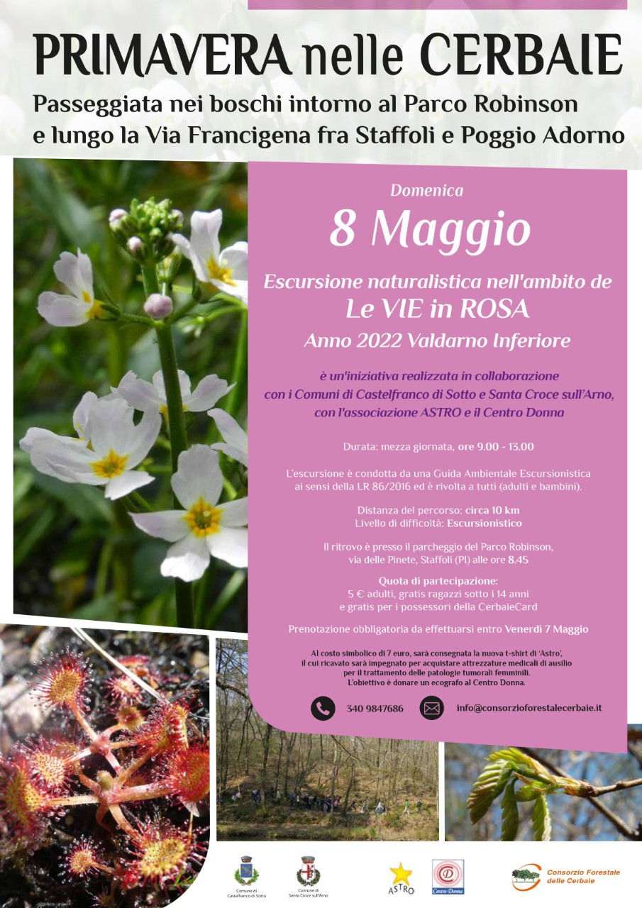Domenica 8 Maggio sulle colline delle Cerbaie si terrà un'escursione nell'ambito delle Primavera nelle Cerbaie. La "Passeggiata nei boschi intorno al Parco Robinson e lungo la Via Francigena fra Staffoli e Poggio Adorno", dalle 9 alle 13, è organizzata dal Consorzio Forestale delle Cerbaie in collaborazione con i Comuni di Castelfranco di Sotto e Santa Croce sull'Arno.