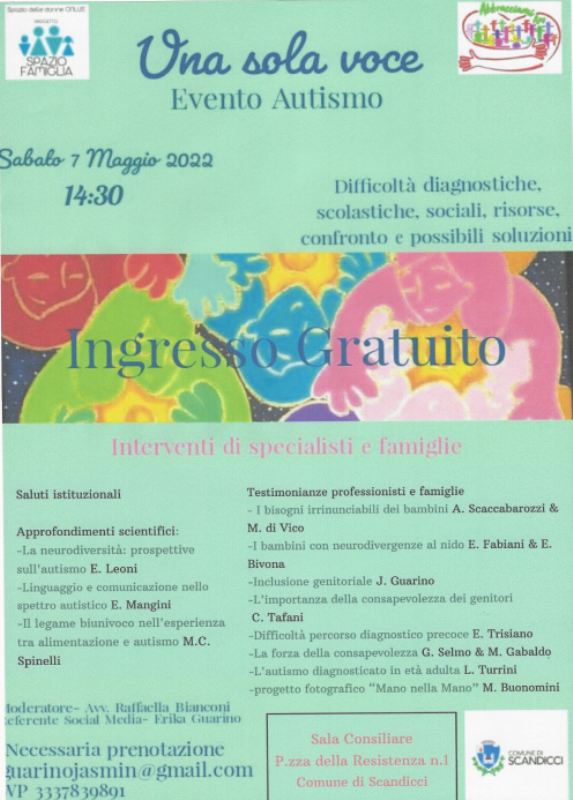 Sabato 7 maggio 2022 nella sala consiliare del Comune di Scandicci si terrà l'incontro "Una sola voce", un evento organizzato dalle associazioni 'Abbracciami' di Empoli e 'Progetto Famiglia' Scandicci in materia di autismo.