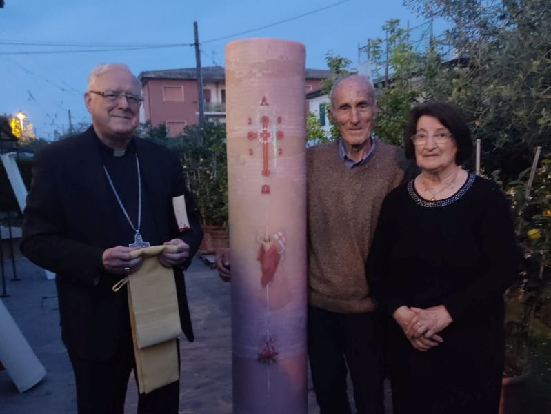 Nell'imminenza del viaggio anche il vescovo di Pescia mons. Filippini non ha voluto far mancare il suo saluto e si è recato personalmente presso l'abitazione di Sauro Innocenti per benedire l'Ape e il grande cero. Stamani alle ore 7 la partenza.