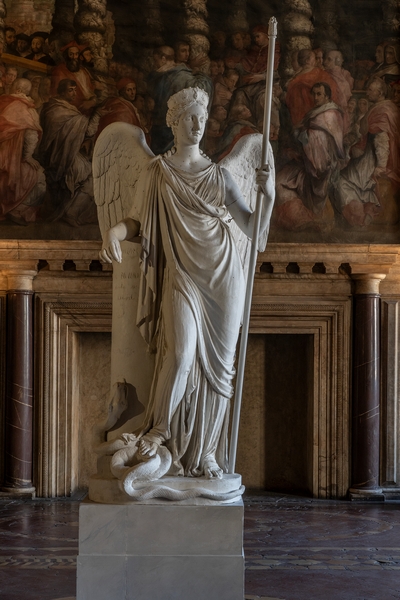 La mostra, curata da Vittorio Sgarbi, realizzata grazie alla collaborazione tra il Museo Novecento e il Museo Gypsotheca Antonio Canova di Possagno, organizzata da MUS.E con Contemplazioni, vede la scultura installata al centro della Sala di Leone X in Palazzo Vecchio. Questo scenario, in cui campeggiano gli affreschi che ripercorrono le tappe dell’ascesa al potere di Giovanni de’ Medici (1475-1521), figlio di Lorenzo il Magnifico, divenuto papa con il nome di Leone X, fa da contraltare al messaggio portato avanti dalla scultura di Canova, che con la sua storia racconta vicende di guerre e di pace. Non ultimo, va considerato in questo contesto l’effige di Cosimo I de’ Medici nelle vesti di Marte, simbolo manifesto del dominio del duca e della sua politica espansionistica.