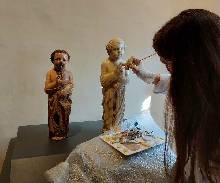 I due capitelli della Badia e la splendida testa di Santo Coronato non erano visibili nelle sale del Museo dal 2005, mentre l’acquasantiera era in deposito dal 2003. Altro recupero importante è la formella con l’Obbedienza, murata all’interno della chiesa di Orsanmichele fino al 2005, poi in deposito al Museo Davanzati, ma non esposta. Quest’ultima trova ora una nuova presentazione accanto alla formella con la Povertà proveniente dalla stessa chiesa fiorentina. Tutte le opere esposte son state oggetto di manutenzione e di restauro conservativo sotto la guida di Benedetta Cantini, funzionario restauratore dei Musei del Bargello.
