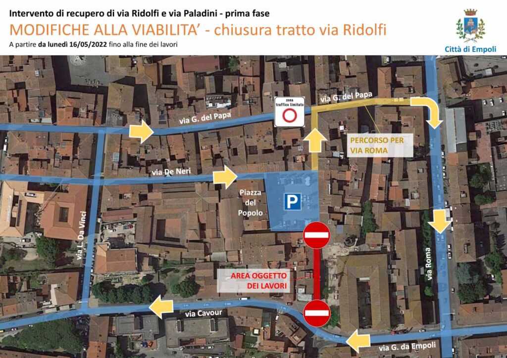 Lunedì 16 maggio 2022 prenderanno il via i lavori per la sistemazione del tratto stradale di via Ridolfi compreso tra Piazza del Popolo e via Giovanni da Empoli, a fianco degli interventi già in corso di realizzazione relativi al recupero dell'Ex Convitto Infermieri e dell'Ex Ospedale di San Giuseppe.