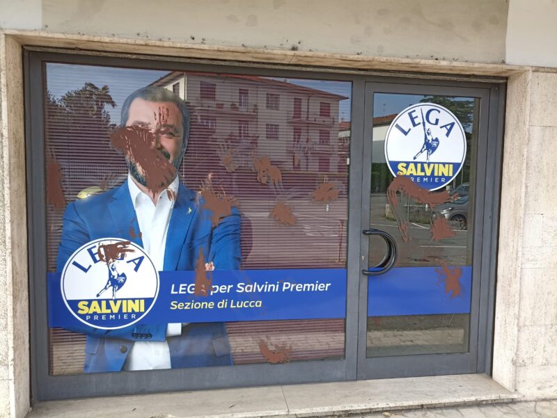 Ignoti hanno imbrattato di vernice la sede della Lega a Lucca. Il fatto è avvenuto nella notte tra mercoledì 11 e giovedì 12 maggio.