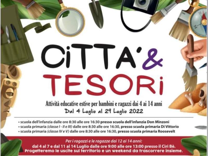 “Città e Tesori”. Uno slogan suggestivo, con un pizzico di mistero che non guasta mai, è stato scelto quest’anno per presentare il calendario delle attività educative estive per bambini e ragazzi (4-14 anni) che si svolgeranno dal 4 al 29 luglio, e che contemplano attività da svolgere presso i plessi scolastici, il Ciri Bé (via Masini) oppure all’aperto, con possibilità per i più grandicelli (12-14 anni) di programmare addirittura un weekend in compagnia.