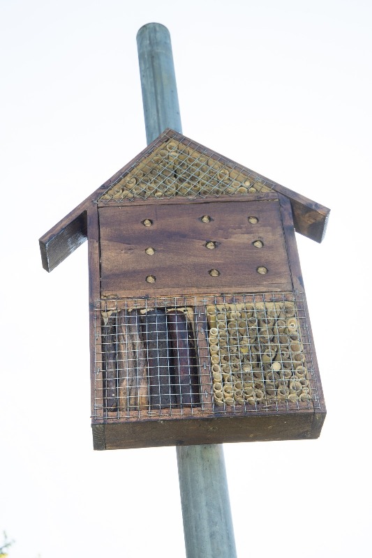 I BEE HOTEL. Hanno dimensioni 44 X 28 (base) X 6,5 cm, colore rovere e/o castagno chiaro. I materiali utilizzati sono naturali: legno massello di abete, multistrato di pioppo; compensato di pioppo; canna domestica (arundo donax); tronchetti di legno varie essenze (erica arborea, cerro etc.) e rete metallica con maglia quadra. Saranno forniti e disposti nell’area di posizionamento delle casette anche 18 cartelli per spiegare ai visitatori, lo scopo del progetto e le finalità degli hotel per le api.