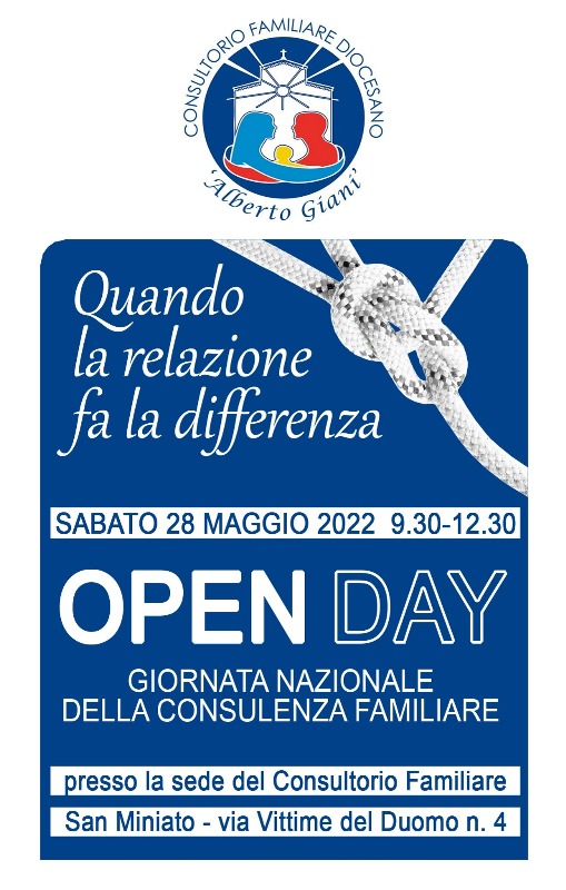 In occasione della Giornata Nazionale della Consulenza Familiare prevista sabato 28 Maggio 2022, il Consultorio Familiare Diocesano Alberto Giani propone un Open Day presso la sua nuova sede, in via Vittime del Duomo n. 4, a San Miniato, dalle ore 9.30 alle 12.30, iniziativa volta alla conoscenza e promozione delle sue attività.