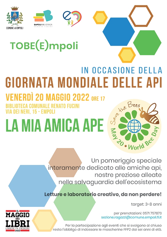 Per venerdì 20 maggio 2022, a partire dalle 17, la biblioteca comunale Renato Fucini, in Sezione Ragazzi, ha organizzato un evento speciale a ‘base’ di letture e laboratorio creativo sulla conoscenza dell’ape appunto. Il pomeriggio comincerà con le storie ad alta voce sulle api, polline e fiori per poi passare al bellissimo laboratorio a sorpresa in cui prenderà vita una creazione a tema. Per partecipare è necessario prenotarsi 0571 757873; sezione.ragazzi@comune.empoli.fi.it. Target: 3-8 anni.