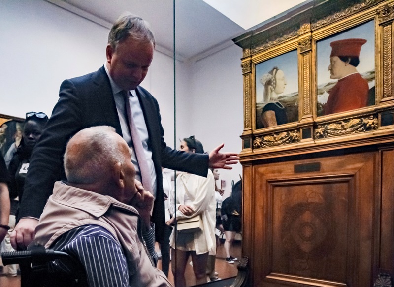 anni: e ad accoglierlo, al suo arrivo, ha trovato il direttore Eike Schmidt, che lo ha accompagnato lungo il percorso. Di fronte alla Nascita di Venere di Botticelli, tra le persone in sala è scattato un applauso per l’eccezionale visitatore, che si è infine concesso un selfie con il direttore nel Terrazzo delle Carte Geografiche, davanti alla splendida veduta in pietre dure del porto di Livorno, sua città natale.