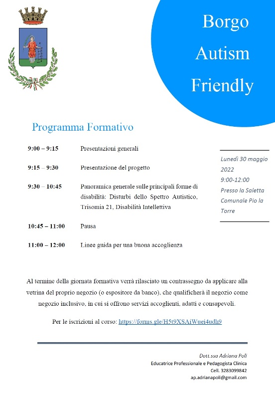 Il corso è il primo evento del progetto "Borgo Autism Friendly" voluto e sostenuto dall’Amministrazione di Borgo San Lorenzo, scritto e presentato al Comune dalla Dottoressa Adriana Poli Educatrice Professionale e Pedagogista clinica, autrice della Tesi "Città Autism Friendly: vivere la città da un nuovo punto di vista", che condurrà l’incontro del 30 maggio.