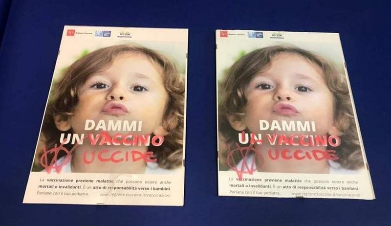 Gli imbrattamenti hanno interessato in particolare la cartellonistica e i manifesti legati alla campagna di vaccinazione contro il Covid e alle vaccinazioni per l’infanzia.