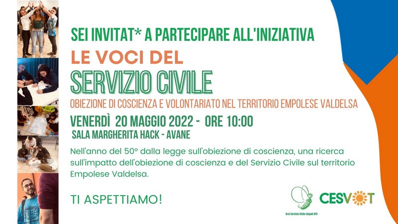 A Empoli, alla SALA MARGHERITA HACK - LA VELA, venerdì dalle ore 10:30, si terrà la manifestazione "Le Voci del Servizio Civile: obiezione e volontariato nell'empolese Valdelsa", organizzata da Arci Servizio Civile Empoli APS.