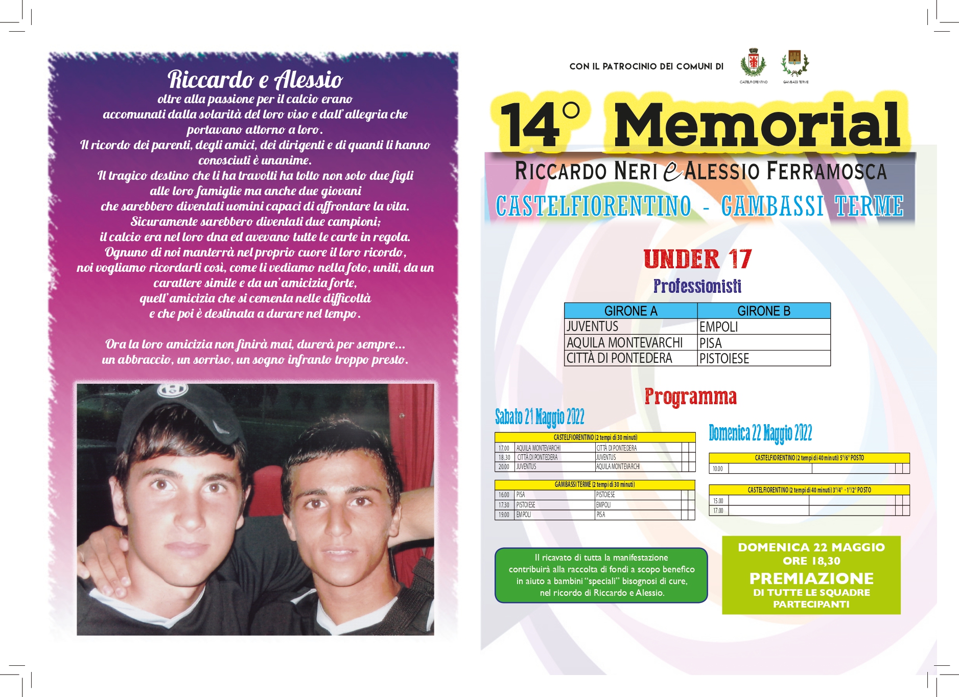 Dopo due anni di fermo causa pandemia, torna il Memorial RICCARDO NERI & ALESSIO FERRAMOSCA 14esima edizione, il Torneo di calcio per ricordare Riccardo ed Alessio, i due giovani calciatori della Juventus che durante un allenamento a Vinovo-Torino, hanno perso tragicamente la loro giovane vita, e il loro sogno si interrompe a soli diciassette anni il 15 dicembre 2006. Il torneo si terrà sabato 21 e domenica 22 maggio allo Stadio Comunale Riccardo Neri di Castelfiorentino.