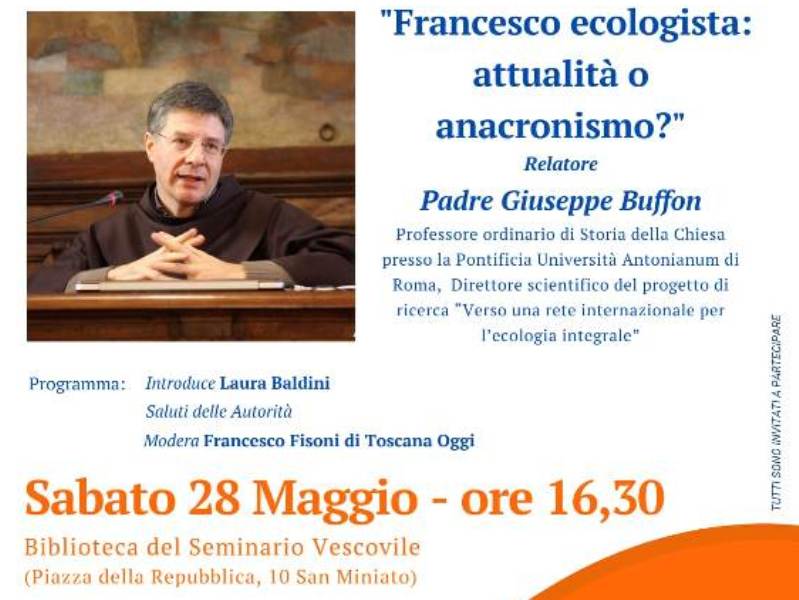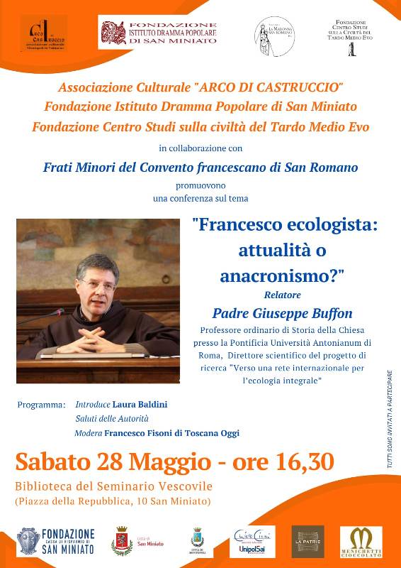 L'Associazione Culturale "Arco Di Castruccio" di Montopoli in Valdarno, la "Fondazione Istituto Dramma Popolare" di San Miniato e la "Fondazione Centro Studi sulla civiltà del Tardo Medioevo" in collaborazione con i "Frati Minori del Convento Francescano di San Romano" sono gli organizzatori della conferenza "Francesco Ecologista, attualità o anacronismo?", che vedrà come relatore Padre Giuseppe Buffon, Professore ordinario di Storia della Chiesa presso la Pontificia Università Antonianum di Roma.