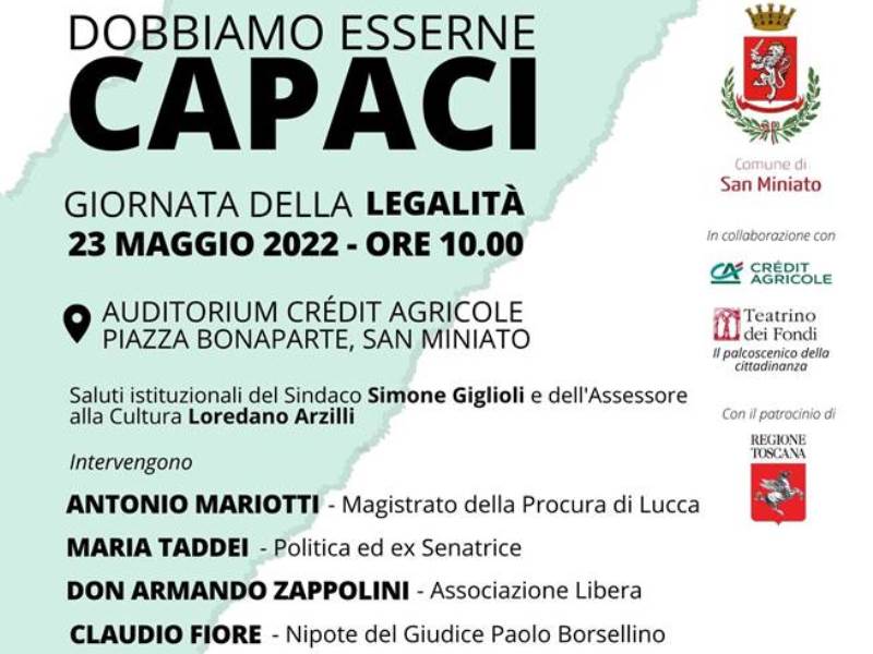 A trent’anni dalla strage di Capaci, avvenuta il 23 maggio del 1992, in cui morirono il giudice Giovanni Falcone, la moglie Francesca Morvillo e gli agenti della scorta Vito Schifani, Rocco Dicillo e Antonio Montinaro, il Comune di San Miniato, in collaborazione con il Teatrino dei Fondi e Crédit Agricole, con il patrocinio della Regione Toscana, organizza l’iniziativa “Dobbiamo esserne Capaci”, una mattinata di incontro e confronto con alcune classi degli Istituti Comprensivi “Sacchetti” e “Buonarroti” di San Miniato, dell’IT “Cattaneo” di San Miniato e del Liceo “Marconi” di La Scala, all'Auditorium di Piazza Bonaparte, in quella che oggi è diventata la Giornata della legalità.