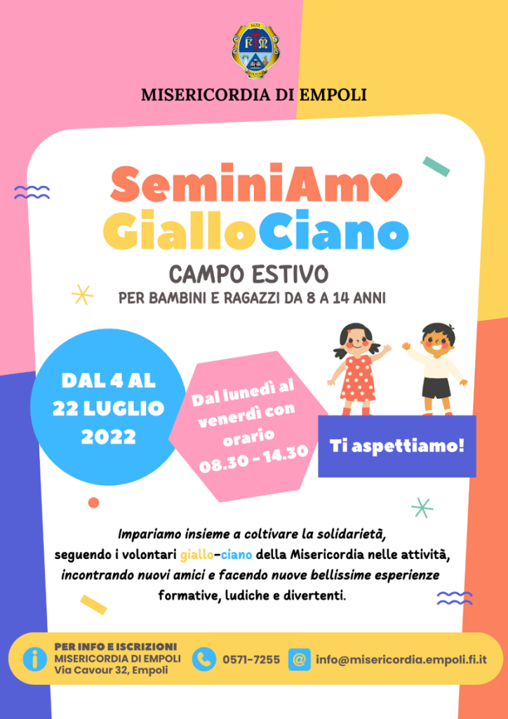 Tre settimane all’insegna della formazione e del divertimento, ma anche della scoperta del mondo del volontariato. Questo il programma del nuovo campo estivo della Misericordia di Empoli, “SeminiAmo GialloCiano”, che si terrà dal 4 al 22 Luglio all’Oratorio S. Andrea (Via Jacopo della Quercia, 29) a Empoli.