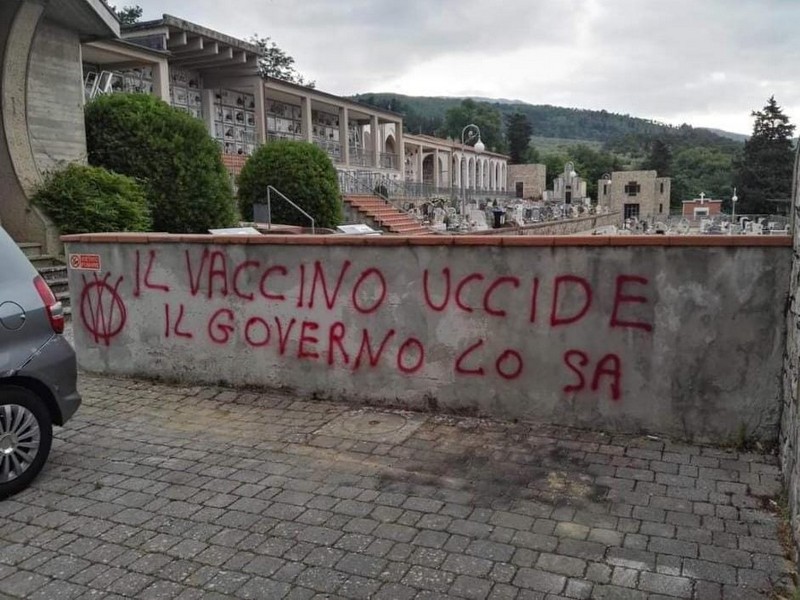Dopo aver preso di mira il drive through, il punto per l'effettuazione di tamponi anti - Covid di piazza della Costituzione, scritte no vax sono comparse oggi sui muri del cimitero di Rocca. Probabilmente nella notte di ieri, ignoti hanno scritto, con della vernice spray di colore rosso, frasi inneggianti ad un presunto pericolo dei vaccini anti Covid e ad un silenzio colpevole del governo. “Il governo mente, il vaccino uccide” e “Il vaccino uccide, il governo lo sa” sono le scritte trovate sul muro posto all'ingresso del cimitero e sulla parete interna dello stesso muro, lungo una scala, che conduce alla parte bassa del cimitero.