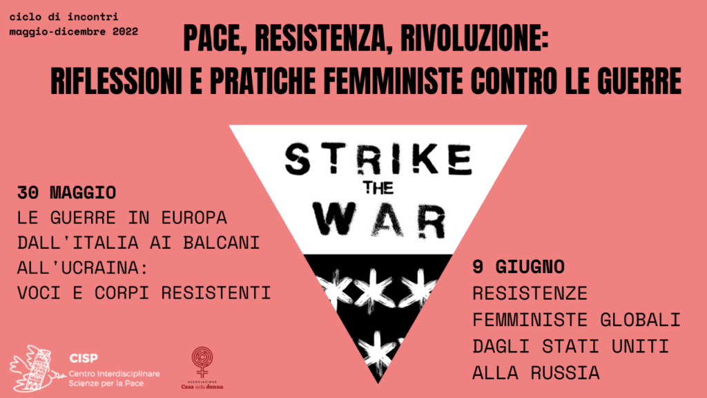 Nasce da qui la volontà del Centro interdisciplinare Scienze per la Pace e della Casa della donna di incontrarsi e discutere. Il ciclo di iniziative, che si svilupperà da maggio fino a dicembre, si propone di affiancare le voci di ricercatrici e teoriche a quelle di attiviste contro la guerra.