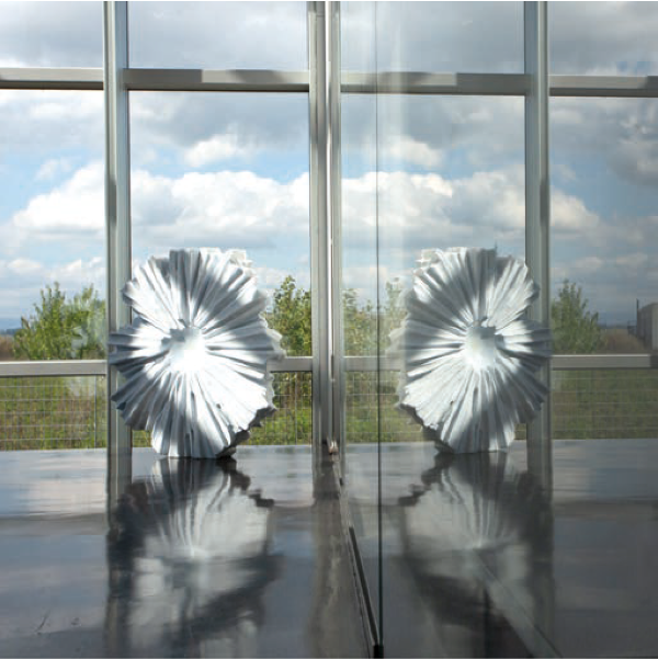 Ed ecco che nelle aree della fabbrica il visitatore potrà godere delle forme quasi impalpabili scolpite nel marmo di Cremoni là dove intanto si svolge il lavoro minuzioso della sarta che intreccia e plissetta a mano e delle macchine più all’avanguardia che stampano in digitale o tagliano con marcatura laser, secondo la filosofia dell’azienda che produce abbigliamento di lusso, coniugando tradizione e innovazione.