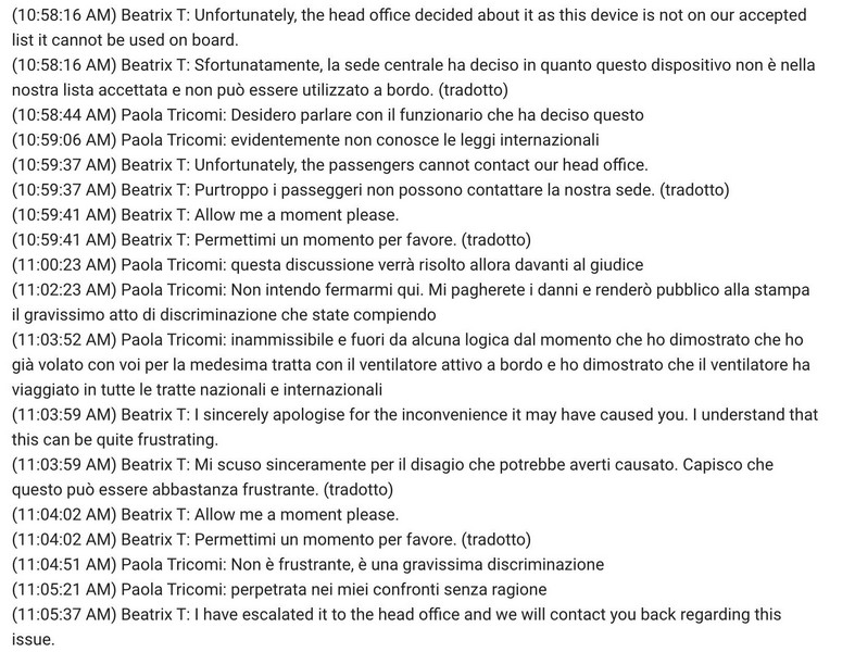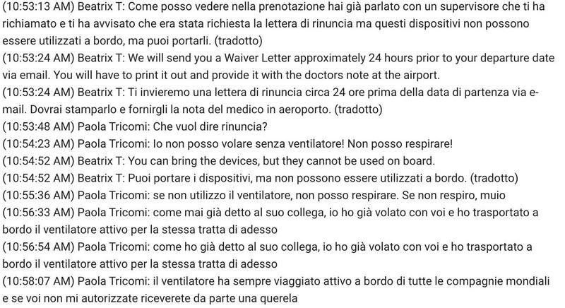Fortunatamente oggi Ryanair ha mutato la sua decisione, forse anche in virtù della grande solidarietà mostrata sul social, cresciuta ora dopo ora dopo che Tricomi ha pubblicato la chat con la compagnia aerea: la studentessa ha mostrato come Ryanair le abbia chiesto una rinuncia all'utilizzo del suo ventilatore polmonare durante il volo e una certificazione del medico in cui si dice che potesse volare senza.
