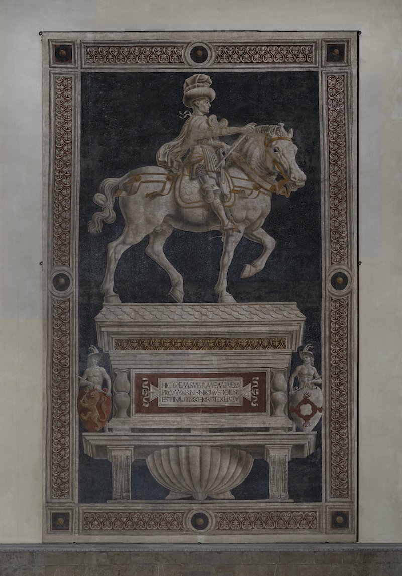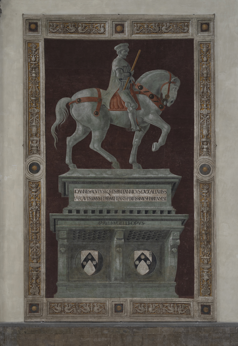Nell’agosto del 1393, quando Giovanni Acuto era in procinto di lasciare Firenze, la Repubblica fiorentina ordina l’esecuzione di un cenotafio scultoreo in suo onore in Duomo, cosa assolutamente eccezionale per una personalità ancora in vita. Al tempo però l’Opera del Duomo non riuscirà a dare corso all’esecuzione del monumento. Un anno dopo, nel marzo del 1394, Giovanni Acuto morirà e sarà sepolto con grandi onori nella Cattedrale di Firenze e in seguito le sue spoglie traslate nella città natale per volere del re d’Inghilterra Enrico II. Trascorso un anno dalla morte dell’Acuto, il progetto di realizzare una tomba in marmo in Duomo sarà ripreso ma abbandonato a favore di un affresco dipinto da Agnolo Gaddi e da Giuliano d’Arrigo detto Pesello. Una commissione che si inserisce in un contesto di opere celebrative destinate a fare di Santa Maria del Fiore un pantheon di personalità eminenti della storia fiorentina del Tre e Quattrocento. Quasi mezzo secolo dopo, il 26 maggio del 1436, l’Opera di Santa Maria del Fiore delibera di realizzare un cenotafio a Giovanni Acuto e appena 4 giorni dopo, il 30 maggio, il nome di Paolo Uccello compare per la prima volta in un vero e proprio contratto, dove si richiede espressamente che il monumento sia realizzato in “terra verde”.  La commissione implicava il rifacimento del precedente affresco del Gaddi e del Pesello, che doveva essersi nel frattempo deteriorato. Dopo un mese l’affresco del condottiero era terminato, ma ecco il colpo di scena: non viene ritenuto idoneo dai committenti e se ne ordina il rifacimento. A Paolo Uccello viene imposto di replicare il dipinto che fu completato entro l’agosto del 1436, giusto in tempo per la solenne inaugurazione della Cupola del Brunelleschi (30 agosto). A Paolo gli fu data in aggiunta la cifra di 64 lire “per sua faticha e prezzo di dipigniere due volte la persona e chavallo di messer Giovanni Aghuto”. Dopo la seconda e definitiva versione dell’affresco, il 17 dicembre 1436, l’Opera chiede a Paolo Uccello di cambiare anche l’iscrizione posta sul sarcofago che riproduce le ultime righe di un panegirico a Fabio Massimo: DUX AETATIS SUAE CAUTISSIMUS ET REI MILITARIS PERITISSIMUS HBITUS EST. La commissione a Paolo Uccello del cenotafio a Giovanni Acuto non è l’unica per il Duomo di Firenze e dimostrano come l’artista fosse considerato una figura di primo piano. Nel febbraio 1443 gli viene commissionata la dipintura del quadrante dell’orologio in controfacciata e due mesi più tardi la doratura della stella delle lancette e la stesura dell’azzurro sulla superficie sottostante. Nello stesso anno viene incaricato di disegnare due vetrate degli occhi della Cupola: la Resurrezione, la Natività e l’Annunciazione, quest’ultima andata perduta nel 1828.