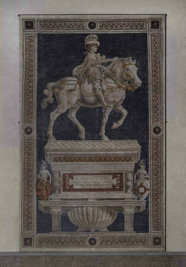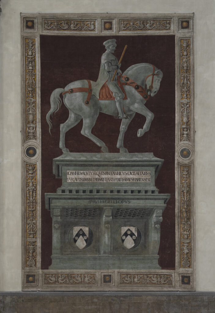 Nell’agosto del 1393, quando Giovanni Acuto era in procinto di lasciare Firenze, la Repubblica fiorentina ordina l’esecuzione di un cenotafio scultoreo in suo onore in Duomo, cosa assolutamente eccezionale per una personalità ancora in vita. Al tempo però l’Opera del Duomo non riuscirà a dare corso all’esecuzione del monumento. Un anno dopo, nel marzo del 1394, Giovanni Acuto morirà e sarà sepolto con grandi onori nella Cattedrale di Firenze e in seguito le sue spoglie traslate nella città natale per volere del re d’Inghilterra Enrico II. Trascorso un anno dalla morte dell’Acuto, il progetto di realizzare una tomba in marmo in Duomo sarà ripreso ma abbandonato a favore di un affresco dipinto da Agnolo Gaddi e da Giuliano d’Arrigo detto Pesello. Una commissione che si inserisce in un contesto di opere celebrative destinate a fare di Santa Maria del Fiore un pantheon di personalità eminenti della storia fiorentina del Tre e Quattrocento. Quasi mezzo secolo dopo, il 26 maggio del 1436, l’Opera di Santa Maria del Fiore delibera di realizzare un cenotafio a Giovanni Acuto e appena 4 giorni dopo, il 30 maggio, il nome di Paolo Uccello compare per la prima volta in un vero e proprio contratto, dove si richiede espressamente che il monumento sia realizzato in “terra verde”. La commissione implicava il rifacimento del precedente affresco del Gaddi e del Pesello, che doveva essersi nel frattempo deteriorato. Dopo un mese l’affresco del condottiero era terminato, ma ecco il colpo di scena: non viene ritenuto idoneo dai committenti e se ne ordina il rifacimento. A Paolo Uccello viene imposto di replicare il dipinto che fu completato entro l’agosto del 1436, giusto in tempo per la solenne inaugurazione della Cupola del Brunelleschi (30 agosto). A Paolo gli fu data in aggiunta la cifra di 64 lire “per sua faticha e prezzo di dipigniere due volte la persona e chavallo di messer Giovanni Aghuto”. Dopo la seconda e definitiva versione dell’affresco, il 17 dicembre 1436, l’Opera chiede a Paolo Uccello di cambiare anche l’iscrizione posta sul sarcofago che riproduce le ultime righe di un panegirico a Fabio Massimo: DUX AETATIS SUAE CAUTISSIMUS ET REI MILITARIS PERITISSIMUS HBITUS EST. La commissione a Paolo Uccello del cenotafio a Giovanni Acuto non è l’unica per il Duomo di Firenze e dimostrano come l’artista fosse considerato una figura di primo piano. Nel febbraio 1443 gli viene commissionata la dipintura del quadrante dell’orologio in controfacciata e due mesi più tardi la doratura della stella delle lancette e la stesura dell’azzurro sulla superficie sottostante. Nello stesso anno viene incaricato di disegnare due vetrate degli occhi della Cupola: la Resurrezione, la Natività e l’Annunciazione, quest’ultima andata perduta nel 1828.