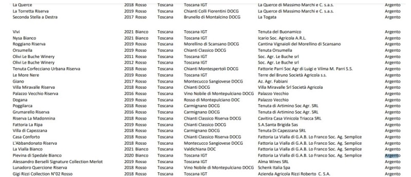 50 Vini Premiati in Toscana: 5 Medaglie Gran Oro (Fattoria Villa Saletta, Tenuta Moriano, Azienda Agricola Pratesi, Icario Soc. Agricola, Podernuovo Soc Agr). 18 Medaglie d’Oro e 27 d’Argento. La Regione è al secondo gradino sul podio per il numero di premiati.