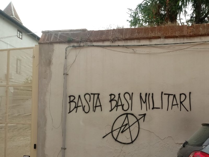 Vari muri del centro della città questa mattina sono stati ritrovati imbrattati da scritte contro basi militari e forze dell'ordine. L'assessore Bedini: "Risalire agli autori di questa vergogna"