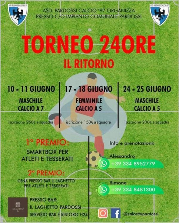 Dopo tre anni di stop a causa del Covid a Pontedera torna un evento sportivo che è una tradizione. Si tratta del Torneo 24 Ore, che va in scena a partire da domani sera, venerdì 10 Giugno, negli impianti comunali della frazione di Pardossi, con l'organizzazione della associazione sportiva Asd Pardossi Calcio 97.