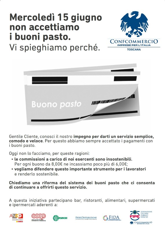 Per avvertire i clienti e condividere le ragioni della mobilitazione, già in questi giorni baristi, ristoratori e alimentaristi stanno affiggendo la locandina predisposta da Confcommercio Toscana. "Gentile Cliente, conosci il nostro impegno per darti un servizio semplice, comodo e veloce. Per questo abbiamo sempre accettato i pagamenti con i buoni pasto. Oggi - si spiega nel manifesto - non lo facciamo, per queste ragioni: 1) le commissioni a carico di noi esercenti sono insostenibili. Per ogni buono da 8,00€ ne incassiamo poco più di 6,00€; 2) vogliamo difendere questo importante strumento per i lavoratori e renderlo sostenibile. Chiediamo una riforma del sistema dei buoni pasto che ci consenta di continuare a offrirti questo servizio".