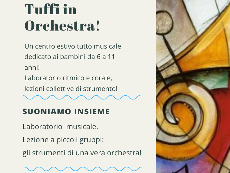 - 11.00- 12.45 Tuffi in Orchestra: la classe verrà suddivisa in due gruppi seguiti da due insegnanti diversi, ogni allievo parteciperà alla lezione di strumento con il gruppo assegnato. Nella settimana ci sarà la possibilità di suonare gli strumenti di un’orchestra.