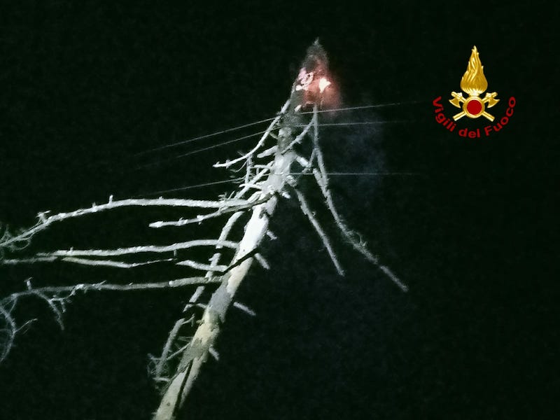 Albero cade sulla linea elettrica, incendio nella notte