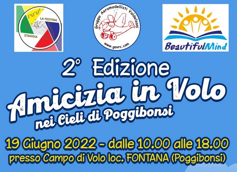 Tutto pronto per "Amicizia in volo nei cieli di Poggibonsi”, che si svolge domani, domani giugno presso l'aviosuperficie di Fontana. La giornata è promossa dal GAV - Gruppo Aeromodellisti Valdelsani - in collaborazione con Beautiful Mind e con il comitato La Festina di Staggia.