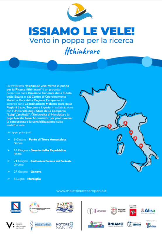 L’idea è nata dai velisti campani Mario Santini, chirurgo toracico dell’Università degli Studi della Campania Luigi Vanvitelli, e Rosario Gracco, imprenditore tessile, Soci della Delegazione della Lega Navale di Torre Annunziata (Na) presieduta da Antonella Giglio che da subito li ha sostenuti. L’iniziativa, accolta dalla Direzione generale per la Tutela della Salute e dal Centro di Coordinamento Malattie Rare della Regione Campania, si è trasformata nel progetto "Issiamo le vele! Vento in poppa per la ricerca" #Thinkrare. L'organizzazione logistica delle tappe nautiche, affidata alla Delegazione Lega Navale di Torre Annunziata (Na), è sostenuta dalla Lega Navale Italiana ed è supportata da Motore Sanità per l'organizzazione delle tappe istituzionali lungo il percorso con il contributo incondizionato di Amicus Therapeutics, Chiesi GRD, Takeda e Medisol. Partecipano all’iniziativa anche i Coordinamenti Malattie Rare delle Regioni Toscana, Lazio e Liguria, in collaborazione con l’Università degli Studi della Campania “Luigi Vanvitelli” e l’Università di Marsiglia. Obiettivo della traversata è favorire occasioni di sensibilizzazione e conoscenza sulle problematiche delle malattie rare anche attraverso la condivisione di buone pratiche e informazioni. Il progetto prevede perciò momenti di confronto e la distribuzione di materiale informativo in ogni tappa.