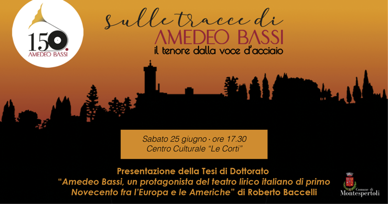 Sabato 25 giugno alle ore 17:30 presso il Centro Culturale ‘Le Corti’ si terrà la presentazione della tesi di dottorato del prof. Roberto Baccelli intitolata "Amedeo Bassi, un protagonista del teatro lirico italiano di primo Novecento fra l’Europa e le Americhe", introdotta dalla prof.ssa Aloma Bardi, direttrice di ICAMus, The International Center for American Music.