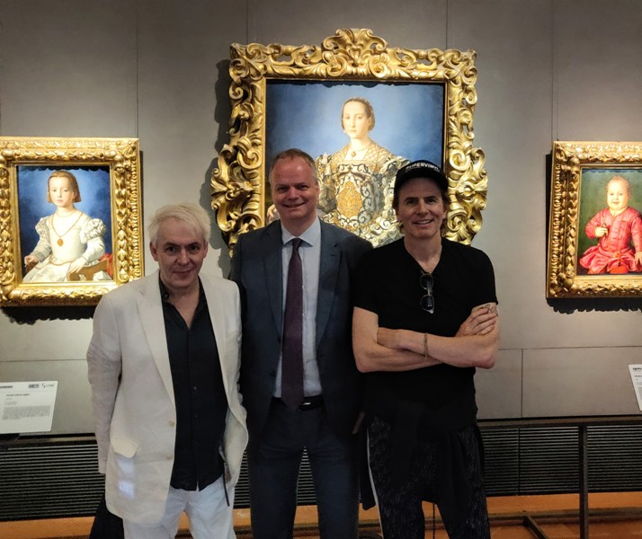 Ad accoglierli e condurli in museo il direttore Eike Schmidt, che ha illustrato approfonditamente ai musicisti inglesi la pittura del Cinquecento italiano attraverso capolavori quali l'Angelo musicante e il San Giovannino di Rosso Fiorentino, la Madonna dal collo lungo di Parmigianino, le Allegorie enigmatiche di Dosso Dossi, i ritratti dei Medici del Bronzino; Taylor e Rhodes hanno apprezzato molto anche la Medusa e il Sacrificio di Isacco di Caravaggio, prima di una sosta rinfrescante al bar in terrazza sulla loggia dei Lanzi.