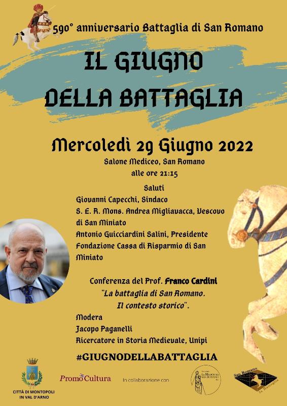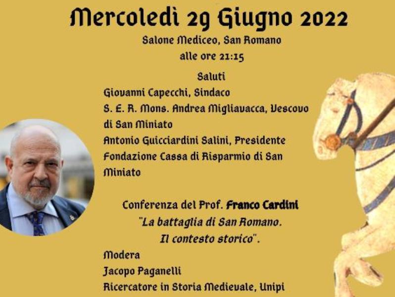 Mercoledì 29 giugno, alle 21.15 nel salone mediceo del convento di San Romano, il professor Franco Cardini terrà una conferenza sul contesto storico in cui si è svolta la battaglia. Dopo i saluti del sindaco Giovanni Capecchi, del monsignor Andrea Migliavacca, vescovo di San Miniato e del Presidente della Fondazione Cassa di risparmio di San Miniato, Antonio Guicciardini Salini, il professor Cardini illustrerà al pubblico quello che era il momento storico di un combattimento reso celebre ed eterno dalle tre tavole di Paolo Uccello. A moderare la serata ci sarà il ricercatore in storia medievale dell'Università di Pisa Jacopo Paganelli.