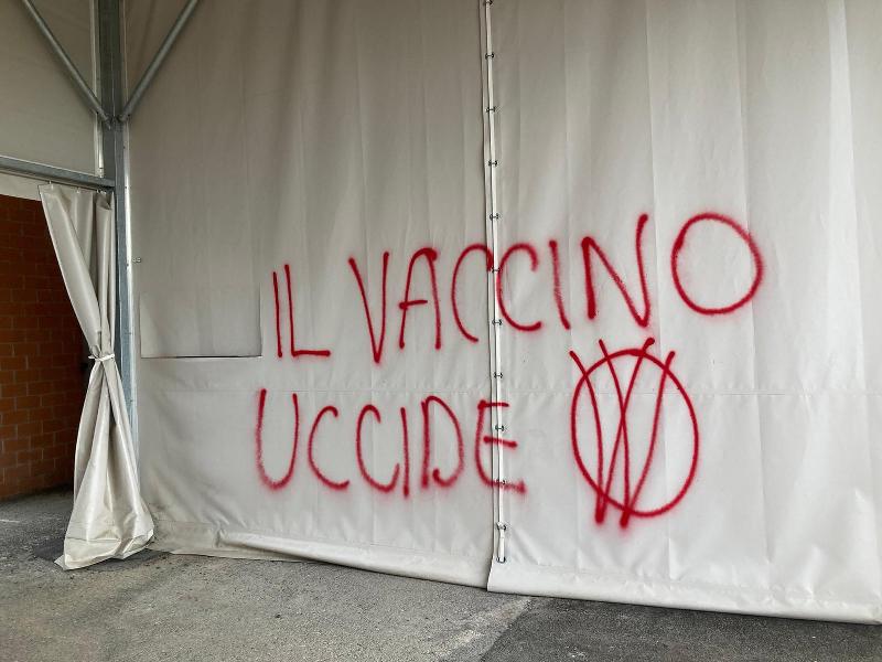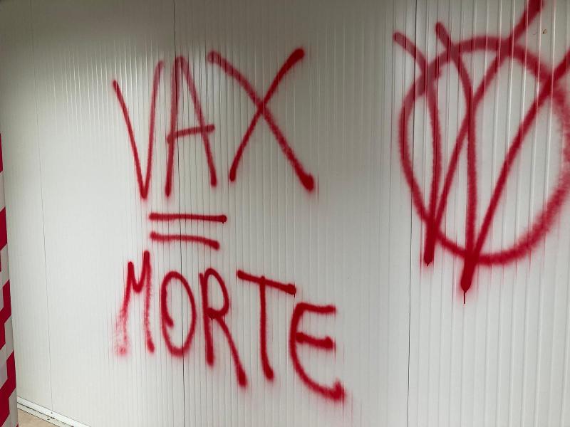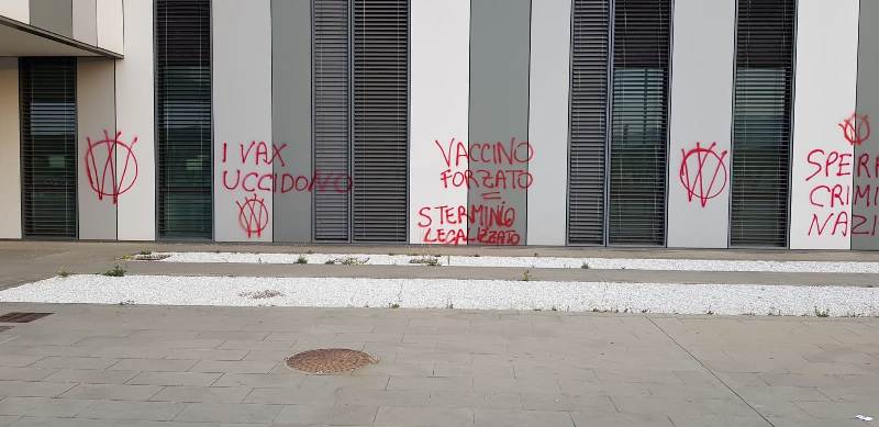 Le scritte, citano il nazismo ed equiparano chi è a favore del vaccino alla morte. Frasi altamente offensive verso i medici, il personale sanitario, le famiglie che sono state colpite dal virus ed hanno perso i propri cari e verso tutti coloro che hanno contratto il Covid ed hanno perso la vita durante il loro lavoro di assistenza e cura della popolazione.