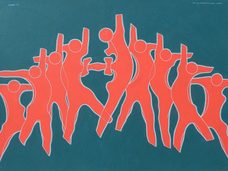 Un deciso accordo cromatico fra il rosso delle figure (unite in un vibrante abbraccio ascensionale al centro) e il blu cobalto del fondo contraddistingue la Tempera su carta esposta nella Sala di ingresso. Il dipinto, eseguito nel 2001 (esposto nel 2018 all’Accademia delle Arti del Disegno di Firenze nella mostra antologica sull’artista intitolata Luce e ombra) rappresenta una delle ultime opere del maestro Cavallini che iniziò a dedicarsi alla pittura quando la salute precaria gli vietò gli sforzi fisici imposti dal bronzo.