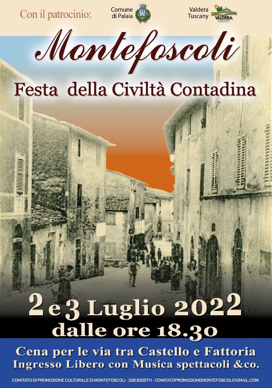 Sabato 2 e domenica 3 luglio torna a Montefoscoli la tradizionale "Festa della Civiltà Contadina", con un percorso gastronomico che quest’anno coinvolgerà anche l’area del vecchio Castello, nella parte più alta del borgo, alla scoperta di sapori autentici e tipici della campagna. Musica, canti, balli, spettacoli per grandi e piccini, mercatino dell'artigianato sono gli ingredienti di questa storica iniziativa, che da anni promuove il territorio con tutti i suoi prodotti, dedicata al buon cibo e alle ricette locali, il tutto in un clima cordiale e festoso, grazie ai molti volontari presenti.