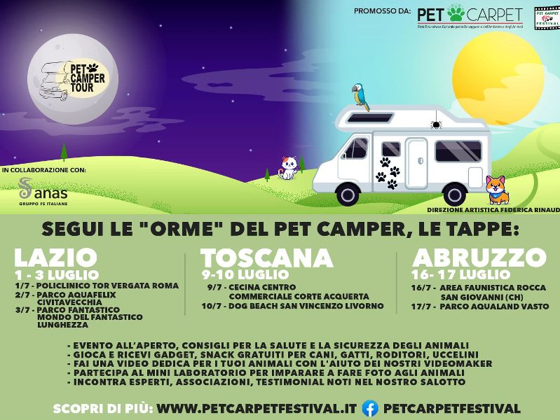 "Tu hai 4 ruote, loro 4 zampe. La tua prudenza ci farà tornare a casa", con questo slogan torna la seconda edizione del Pet Camper Tour che quest’anno si propone come campagna di sensibilizzazione viaggiante, in collaborazione con Anas (Gruppo Fs Italiane), in difesa di tutti gli animali, abbandonati o selvatici, purtroppo spesso vittima di incidenti a causa della velocità. Migliaia di impatti sulle strade che coinvolgono, in alcuni casi drammaticamente, gli stessi umani.