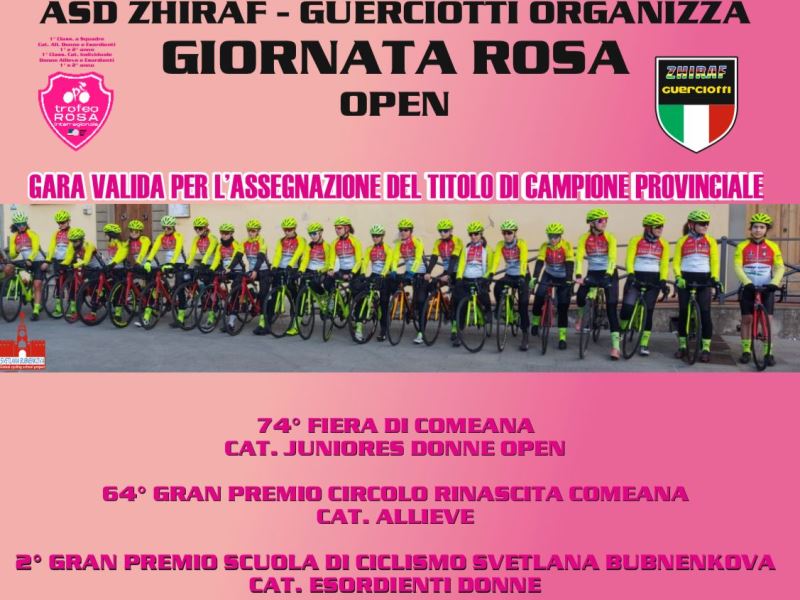 Domenica 3 Luglio 2022 avrà luogo invece La Giornata Rosa, gara ciclistica su strada tutta al femminile,valida per l’assegnazione del titolo di Campione Provinciale ed organizzata dal Team Zhiraf-Guerciotti, con il contributo del Comitato Olimpico Nazionale Italiano, della Federazione Ciclistica Italiana e dei Comuni di Prato, Carmignano e Poggio a Caiano.